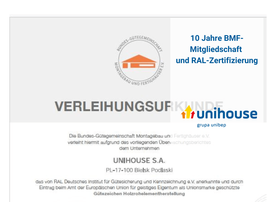 Wir danken allen unseren Partnern, Kunden und Mitarbeitern für die gemeinsame Arbeit am Aufbau unserer Marke und das Erreichen dieser renommierten Auszeichnung. Unihouse steht für zertifiziertes Bauwesen, auf das Sie sich verlassen können!